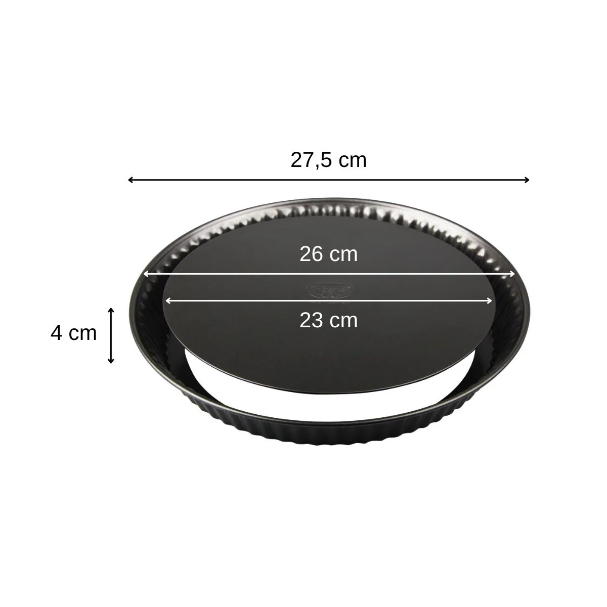 - Dimensions extérieures 27,5 x 4 cm, dimensions intérieures 26 cm de diamètre haut, plateau amovible de 23 cm de diamètre